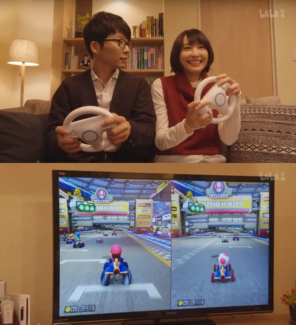健身环之前,新垣结衣和任天堂游戏的上一次同屏,是在2016年播出的《逃避可耻却有用》里,彼时Switch尚未发售,Wii U还在继续发挥余热。第10集开头,多次争吵、试探后,森山实栗和津崎平匡终于确定恋爱关系,他们一起玩《马力欧卡丁车8》,还用上了方向盘外设。