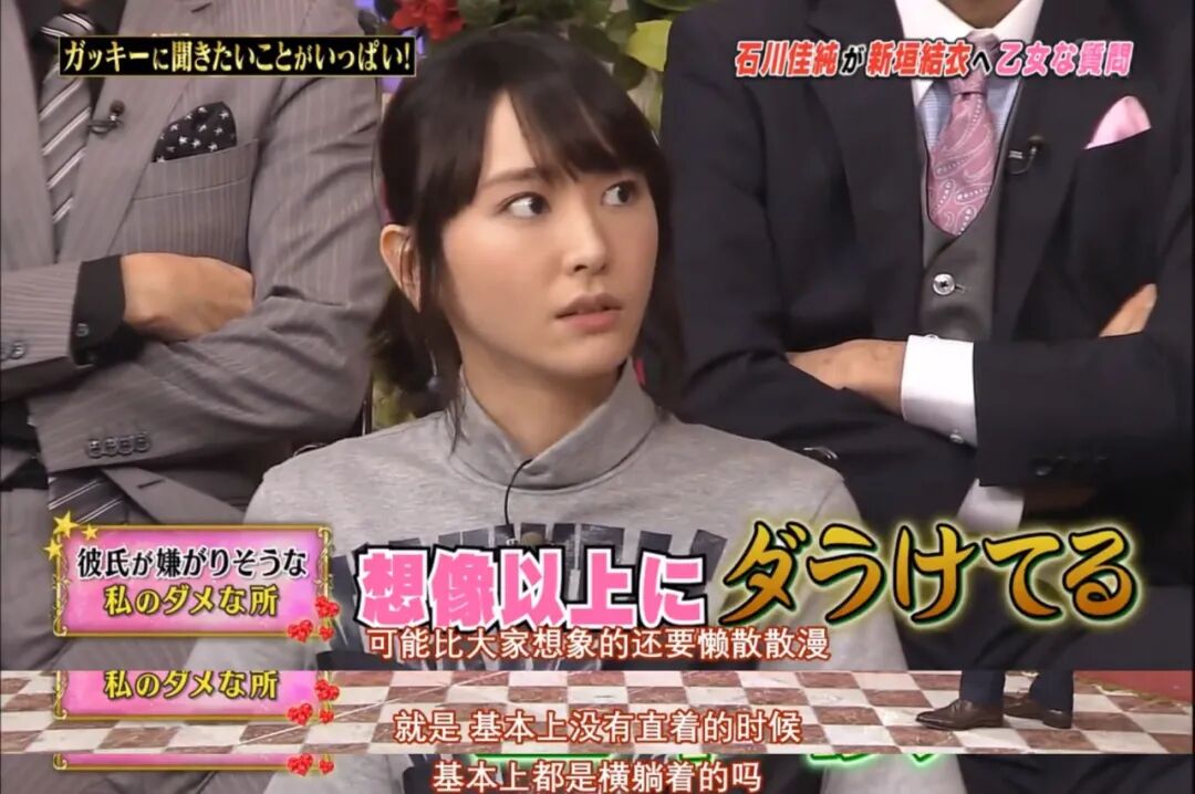 在最新一期《人间观察》节目里,另一个嘉宾藤井隆提问:Gakki新年打算做什么?嘴里还在咀嚼千层年糕,没办法用话语回答的Gakki很自然地把身体靠在沙发上,做出使用遥控器、按压健身环的样子。