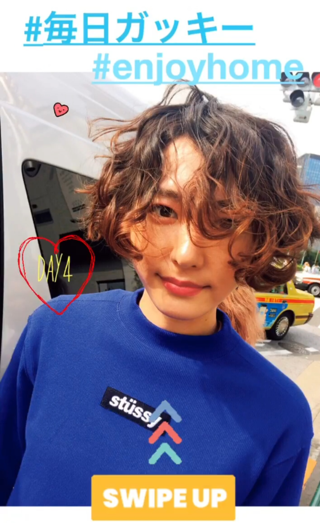 穿着蓝色卫衣顶着泡面头的Gakki。