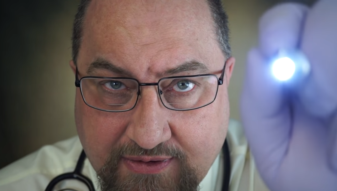 图来自Youtuber“TirarADeguello”1月12日更新的ASMR视频,他在这期视频里扮演和模拟了医生探病的角色情境,而观众则带入“病人”的身份