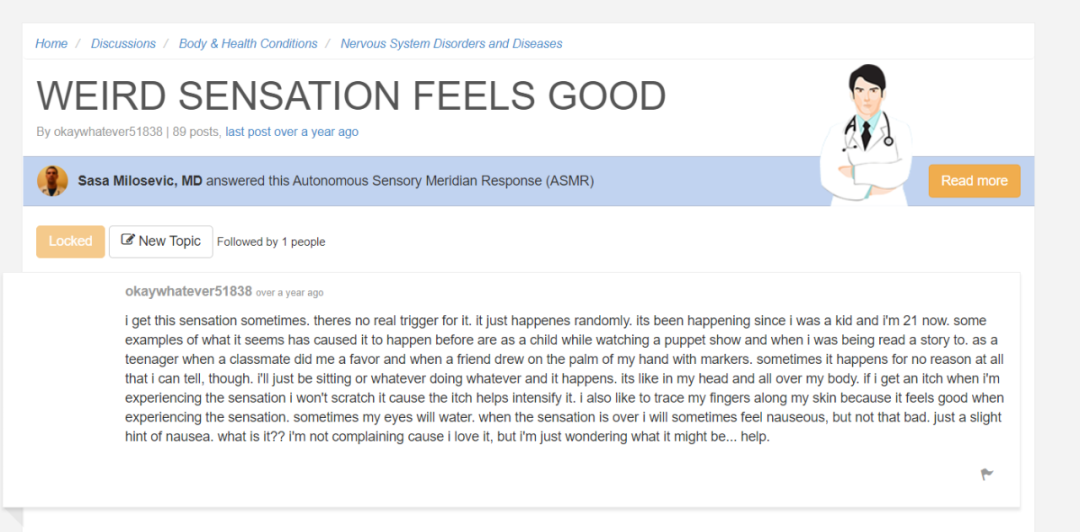 “okaywhatever51838”并不能准确描述和定义自己的这种体验,于是他选择求助SteadyHealth的专业医生资讯,尽管当时已经有大量的用户跟帖“okaywhatever51838”表示自己也有过近似的体验,但SteadyHealth的医师由于缺乏对这种现象的准确定义,并不能给出准确答案。