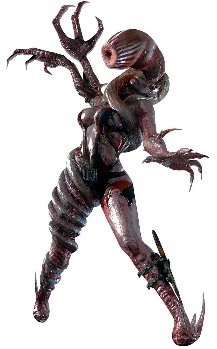比如5代和威斯克一起行动的妖艳女反派艾克塞拉,被威斯克注射了响尾蛇病毒之后变成了一滩巨大的黑色触手;6代利用C病毒特性“复刻”了艾达王外貌的反派卡拉,最后变成了裹满白色粘液的畸形生物;《启示录》CG里就被变异怪物杀死的FBC特工瑞秋,在后来的流程里被T深渊病毒感染变成了滴漏者,最诡异的是它身上还保留了一些“性感”要素,后来还被做成了DLC成了突击模式里的可用角色...
