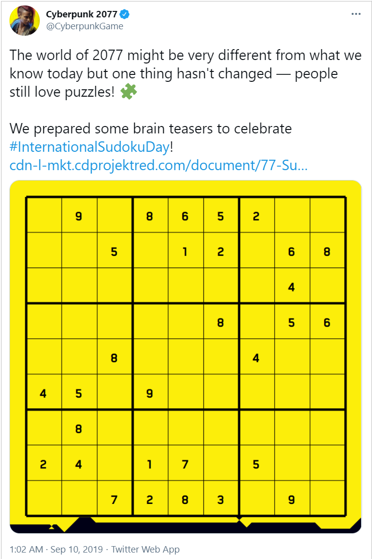 2019年游戏尚未发售之前,CDPR官方推特就曾发布一个数独,解开后可以获得署名为“先知盖瑞”的留言: