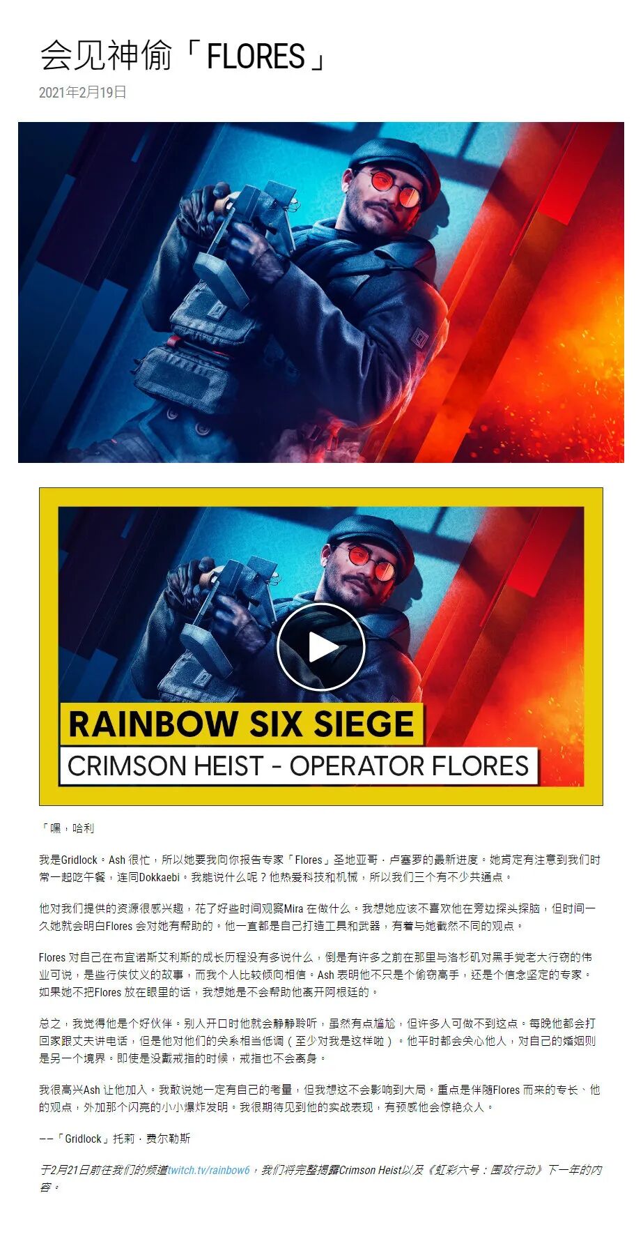 2月22日,育碧通过直播揭示了《彩虹六号:围攻》第六年的更新计划,以及即将到来的第六年第一赛季“绯红劫案”的各项内容。