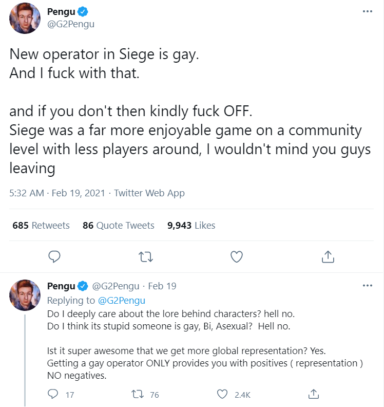 不过,Flores毕竟是《彩虹六号:围攻》59个干员里第一个且唯一一个同性恋者,大多数玩家对这个设定的反应没那么剧烈,《彩虹六号:围攻》赛事的解说Parker”INTERRO”Mackay也发推表示这是很酷的一个设定,而《彩虹六号:围攻》的知名选手Pengu则表示这个设定不会给游戏带来任何的负面影响,只会带来人权层面的推进,如果有的玩家因为这个设定弃坑,他不在乎《彩虹六号:围攻》的玩家少点儿。