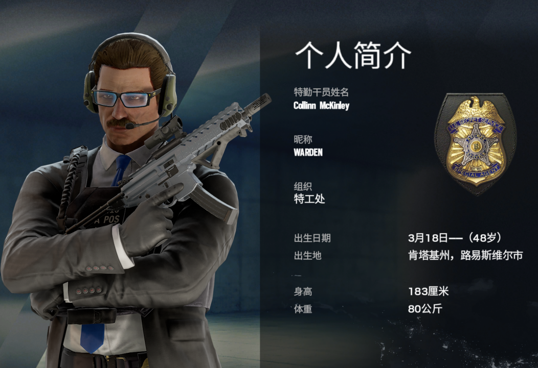 这之后,育碧在第四年第二赛季带来了防守干员Warden,美国特工处出身,在华盛顿干过各种政要人员的护卫工作,也不知道为什么就加入了虹彩小队这支反恐队伍。能力是可以防闪光弹的墨镜,也不是他自己开发的,按理说人人都可以戴这个眼镜。