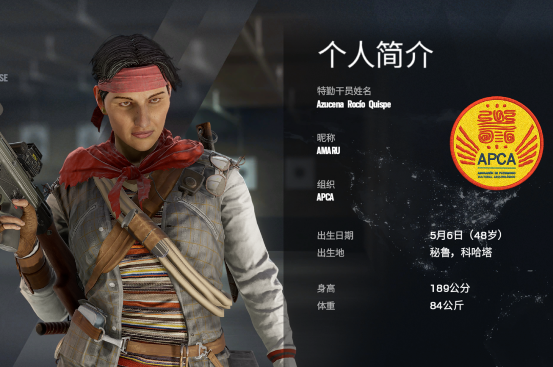 第四年第三赛季,进攻方新干员Amaru隶属于虚构的秘鲁文物保护反掠夺组织,能力是用一个钩绳发射枪让她做一次立体机动,不知道的还以为是印第安纳琼斯。