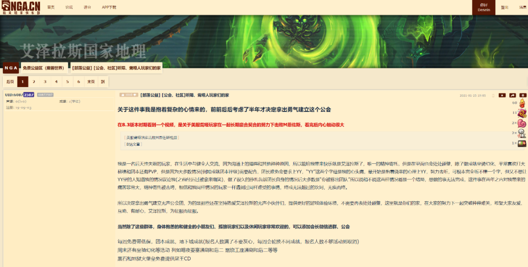 当然,事实证明这完全不是问题。今年1月底,她在NGA论坛的魔兽世界公益区发布帖子,介绍了自己的情况和新建的公会。目前为止,该帖已经收获了18页的回复,所有人都对此表示支持,随即陆陆续续有40人左右加入了这个公会,包括闻风而来的聋哑人玩家和部分志愿者。