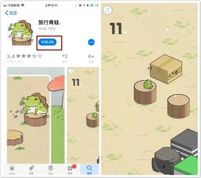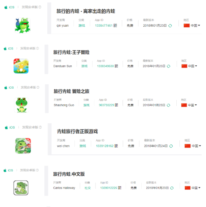 当时日本HIT-POINT制作的放置类手游《旅かえる》大火,搜索量攀升,但是因为APP原名为日语,存在一些搜索障碍,就给这个《旅行青蛙.》钻了空子,用中文名出现在App Store中,玩家购买下载之后才发现其实就是跳一跳游戏。