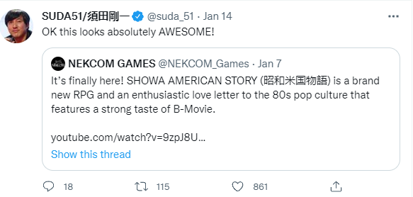 游戏制作人猫老大也凭借这次亮相完成了“追星”———游戏界著名鬼才制作人须田刚一在推特表达了对《昭和米国物语》的喜爱。