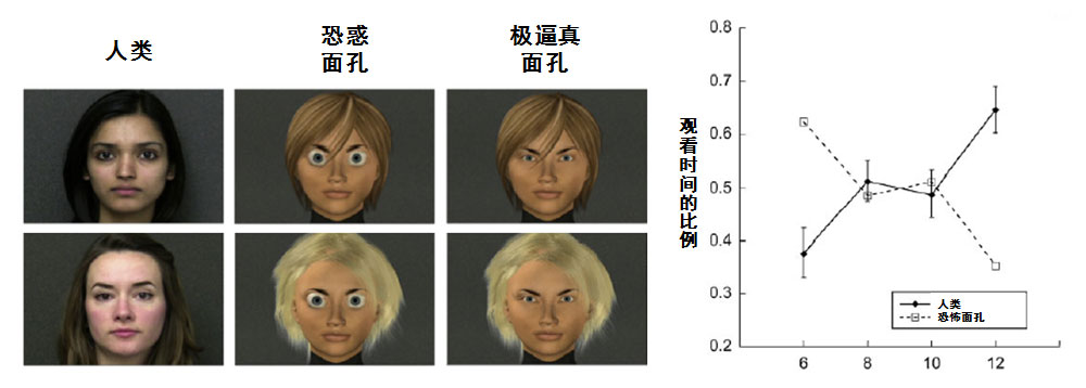 恐怖谷效应的相关理论提出后,一些科学实验也证实了这一现象可能与我们的对人类面孔识别能力的发展而来,实验人员将人类面孔、恐怖面孔、极逼真面孔三类影像给6、8、10、12个月大的婴儿观看,婴儿对于恐怖面孔的注视时间呈线性趋势减少。