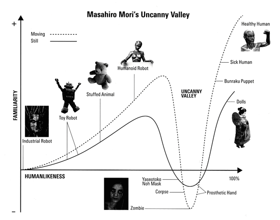 森政弘的恐怖谷理论曲线,当相似程度达到一定程度,我们会产生厌恶感