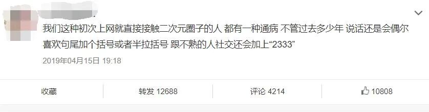 当然,并不是说在句尾加上半拉括号的人统统都是二次元,也不是说二次元都一定会在句尾带上半拉括号,但有如此语癖的,十有八九都包含着相当程度的老二次元成分。毕竟,近年来,每隔一段时间在互联网上都会有类似的说法,引起网友们的广泛共鸣。