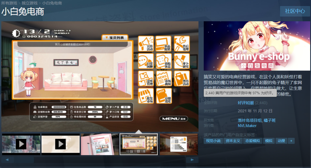 获得这个评价的《小白兔电商》,是由中国制作组橘子班制作的一款带有模拟电商经营要素的Galgame,目前在Steam上保持着97%的超高好评率。