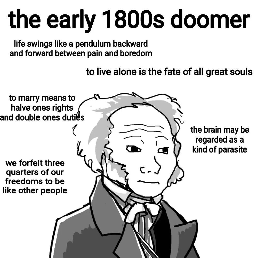 这时我们需要从Doomer的老祖宗说起,因为Doomer绝对不是一个新的概念,为此,我们需要参考19世纪哲学家亚瑟·叔本华,可能是历史上最早的Super emo人,也是最初的Doomer。
