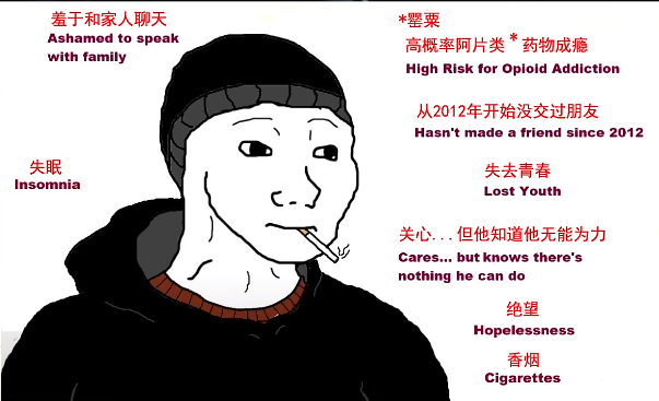 比较常见的Doomer形象如下:毛线帽,连帽衫,看起来三天没睡,对酒精、尼古丁和药物上瘾,并且有一系列的心理问题。