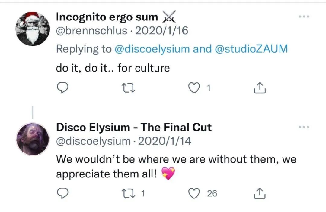 优秀的游戏传达给玩家们的远不止娱乐,而玩家则乐意去维护富有诚意的开发者,为自己喜欢的作品创作新的东西,这种关系会在玩家和开发者之间形成无比美妙的文化,正如《极乐迪斯科》制作组ZA/UM和Ash这样的玩家所做的那样。