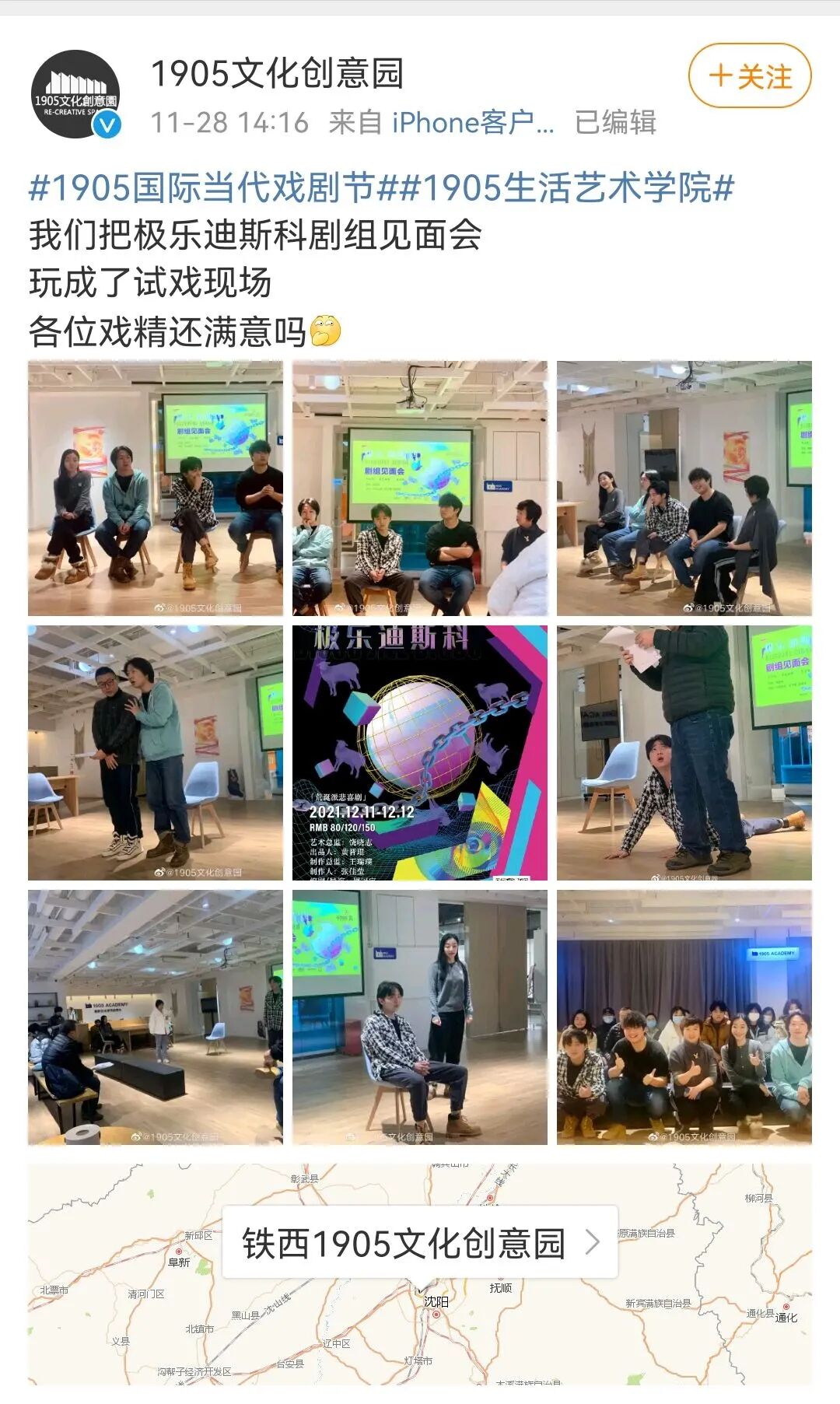 事情的经过也很简单:10月15日,沈阳的「1905文化创意园」发布演员招募公告,公布了一部叫做《极乐迪斯科》的“黑色幽默悲喜剧”,该剧由「晓年青剧团」旗下导演——周冠宇“编剧、执导”,并宣布即将于12月11日正式演出。