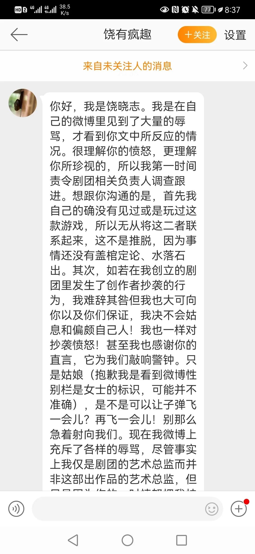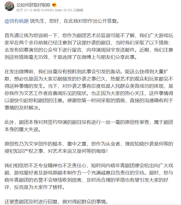 平心而论,饶晓志是一名还不错的导演,执导过《无名之辈》这样的佳作,但他的回应偏偏有一种“不知者无罪”的意味,且不说等待调查结果,要是没有玩家们的积极发声,恐怕剧团直到演出结束都不会对抄袭事实有任何交代。