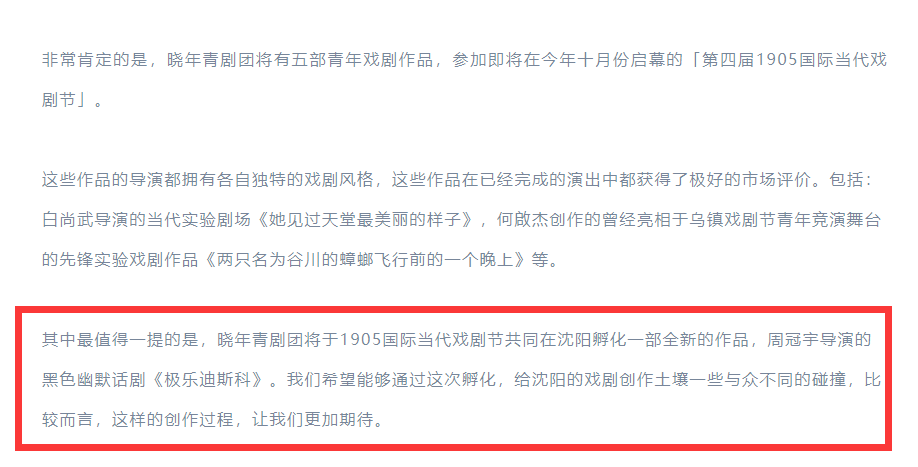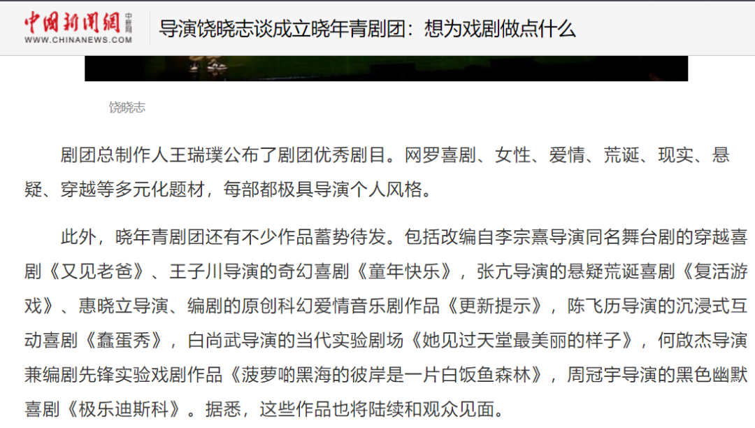 报道导语中提到了剧团成立的初衷是“旨在吸纳更多愿意投身于戏剧行业的优秀导演、编剧、演员,以及热爱戏剧的幕后工作人员”,还提到晓年青剧团还有不少作品蓄势待发,包括周冠宇导演的黑色幽默喜剧《极乐迪斯科》在内的众多作品也将陆续和观众见面。