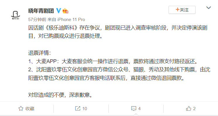 而到了11月30日晚9点,事情又有了进一步的发展,晓年青剧团再次发布微博,宣布因话剧《极乐迪斯科》存在争议,剧团现已进入调查审核阶段,决定停演该剧目,对已购票的观众进行退票处理。