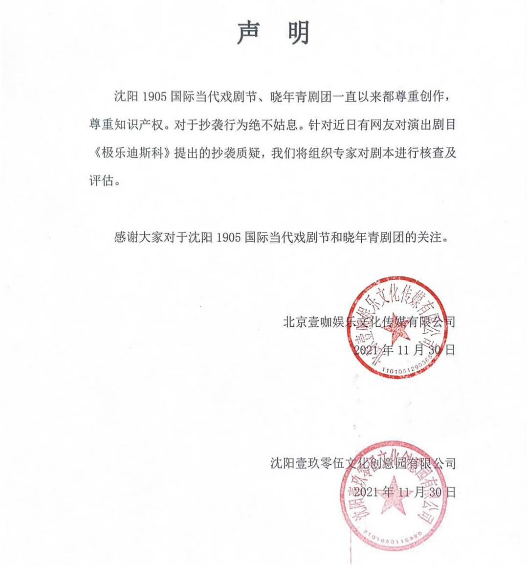 戏剧节官方发表声明会与剧团一起组织专家,进行剧本的核查评估,若确实存在抄袭行为则绝不姑息。轻语工作室也会与《极乐迪斯科》的开发商ZA/UM联络,继续向上反映。
