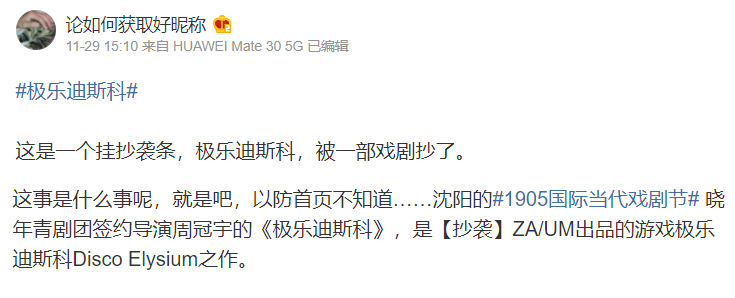 11月29日,一个普普通通的星期一下午,一则沈阳某戏剧团抄袭知名CRPG《极乐迪斯科》的消息吸引了游戏动力编辑部的关注。