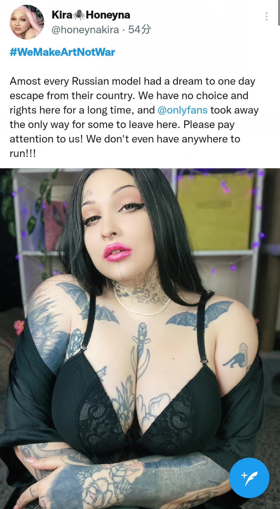 OnlyFans的地区封禁持续了一段时间,来自俄罗斯的内容创作者面临断粮危机,不得不在社交媒体上发起#WeMakeArtNotWar的请愿,表明自己不能从OnlyFans这个最大的收入平台获取资金,相当于断绝了他们的生活来源,不解为什么只因为自己是俄罗斯人就要被封禁。