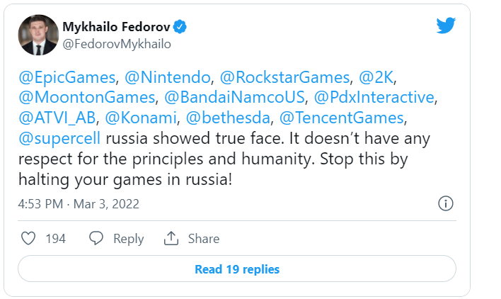 同样的情况也发生在游戏领域,比如乌克兰副总理米哈伊洛·费多罗夫在推特上发表了一封公开信,呼吁所有的游戏厂商暂时封禁来自俄罗斯和白俄罗斯玩家的账号,还顺带把游戏公司艾特了个遍。