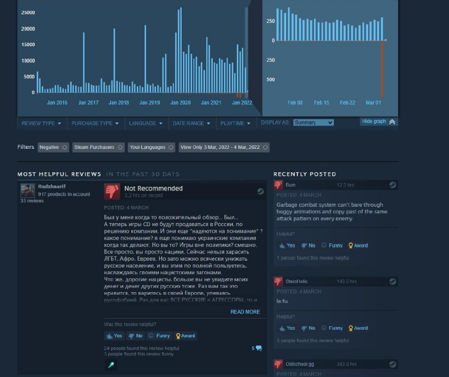 ▲在宣布停止对俄罗斯售卖游戏后,CDPR游戏在Steam受到了差评攻击