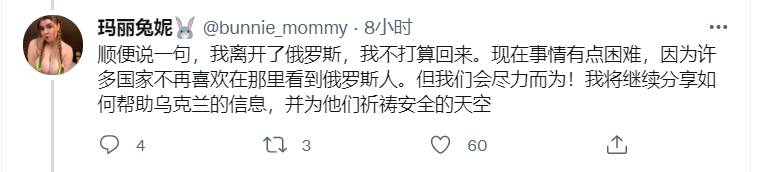 这种糟糕的情况甚至引发了俄罗斯当地模特、艺术家的“出逃”,在滚石杂志针对此次事件的采访中,俄罗斯内容创作者Bunnie Mommy表示在账户被封期间,她至少损失了6000美元的收入,目前她已经离开俄罗斯,并且不准备再回去。