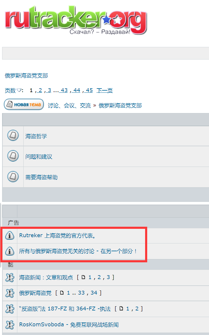 所以你甚至可以看到在RuTracker的主页底部有一栏叫“海盗党党支部”,这个以“数据开源”为纲领的全球性组织曾在13年组织了1600家网站罢工,以示对《俄罗斯反盗版法》的抗议。