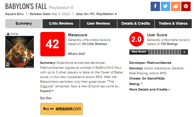 制作过《尼尔:自动人形》《异界锁链》《猎天使魔女》的白金工作室,最近推出了他们第一款多人在线游戏《巴比伦陨落》,暴死了。