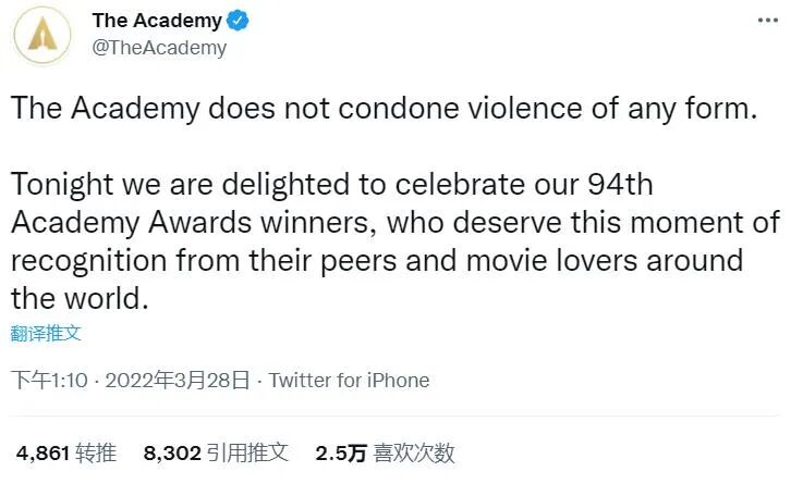 奥斯卡主办方表示:“我们不容忍任何形式的暴力。”