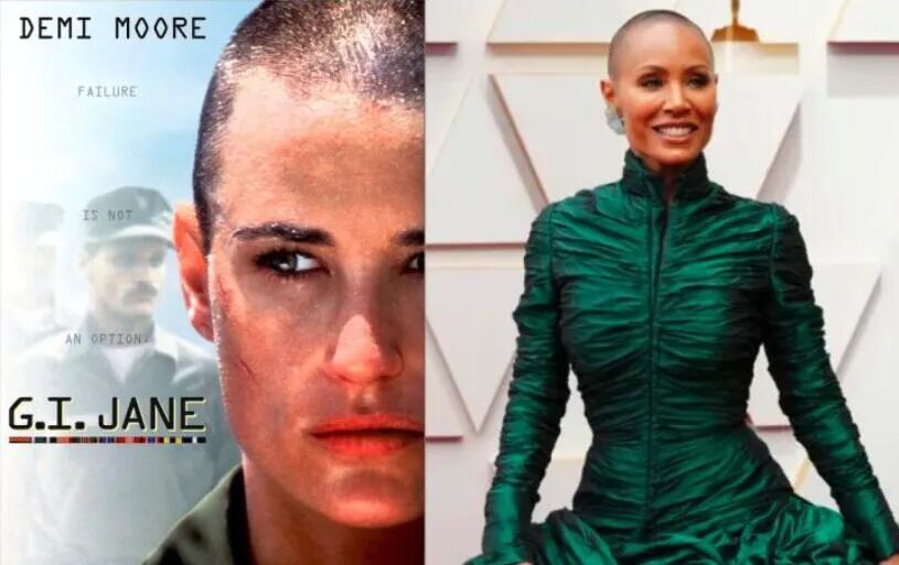 在《魔鬼女大兵》里,女主的造型是一个光头,而威尔的太太贾达,由于受到斑秃的困扰,刚在2021年不得不把自己剃成了光头。很明显,这个造型并不是自愿的选择。