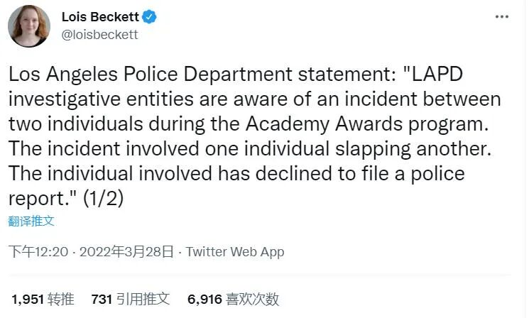 洛杉矶警察局也通过记者作出回应:“我们注意到了一件发生在奥斯卡颁奖典礼上的当众暴力事件,但被打方选择拒绝向警方报案。如果有相关人员希望警方介入调查的话,洛杉矶警察局可以提供帮助。”
