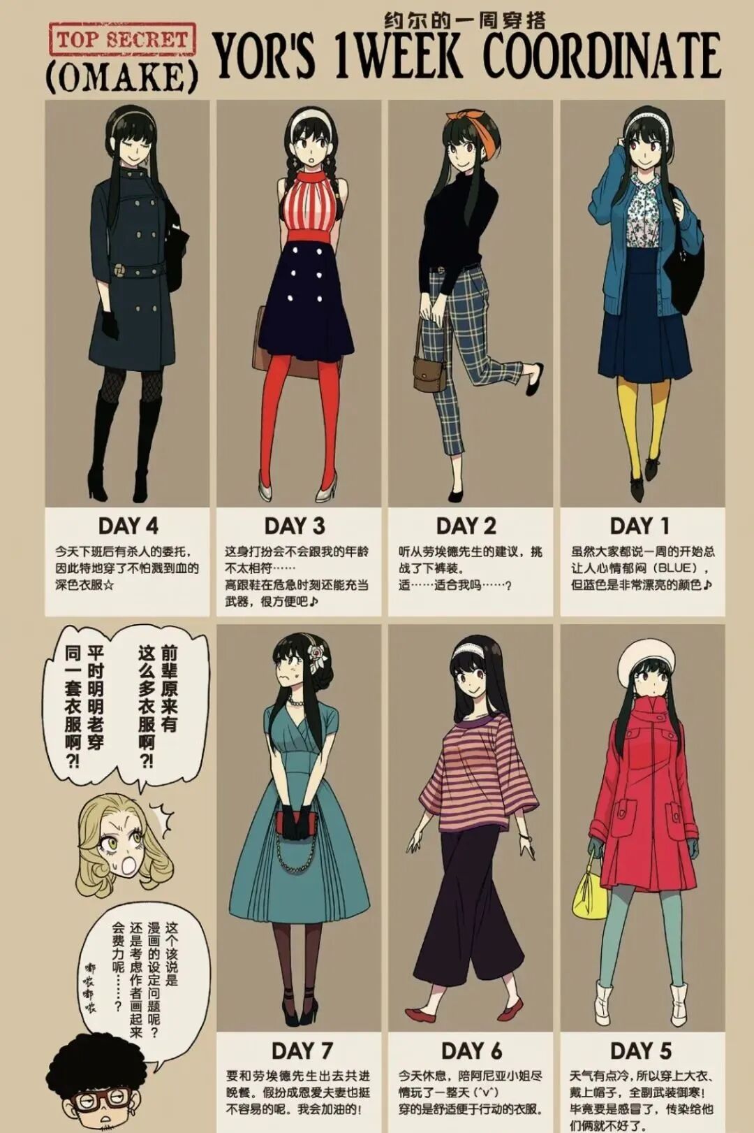 这些复古感觉主要体现在漫画中的人物服装、机械设定、场景取材、色彩运用上,比如女主角约尔的服装就有典型的上世纪60年代时装风格,常出现的彩色连裤袜和双排扣设计都是典型范例,有一些也会出现嬉皮士风格,总体来说《间谍过家家》在年代设定和取材方面是比较用心的,当然,是在糅合日系漫画风格的基础上。