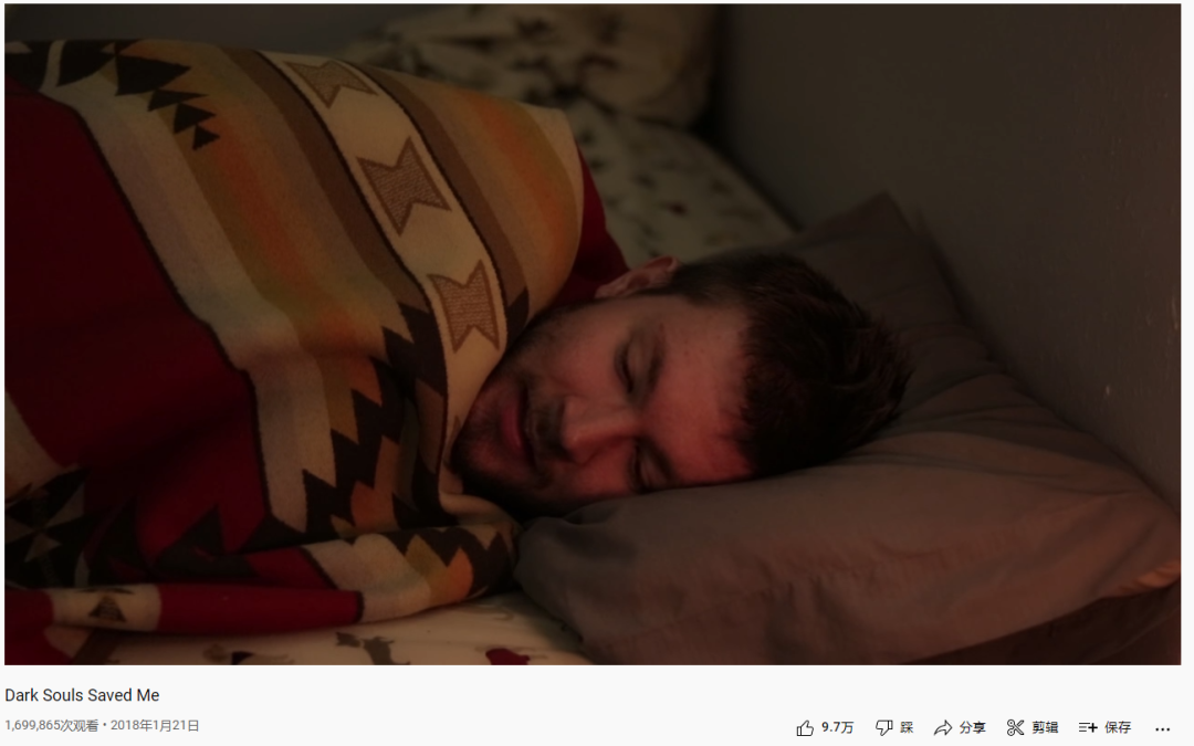 并且点击相关链接,你可以刷到一位Youtuber看起来非常厌世的卷缩在床上,漫无边际地讲述自己曾经的轻生念头,不过这则视频的主题在标题里已经体现的很清楚了——Dark Souls Saved Me。