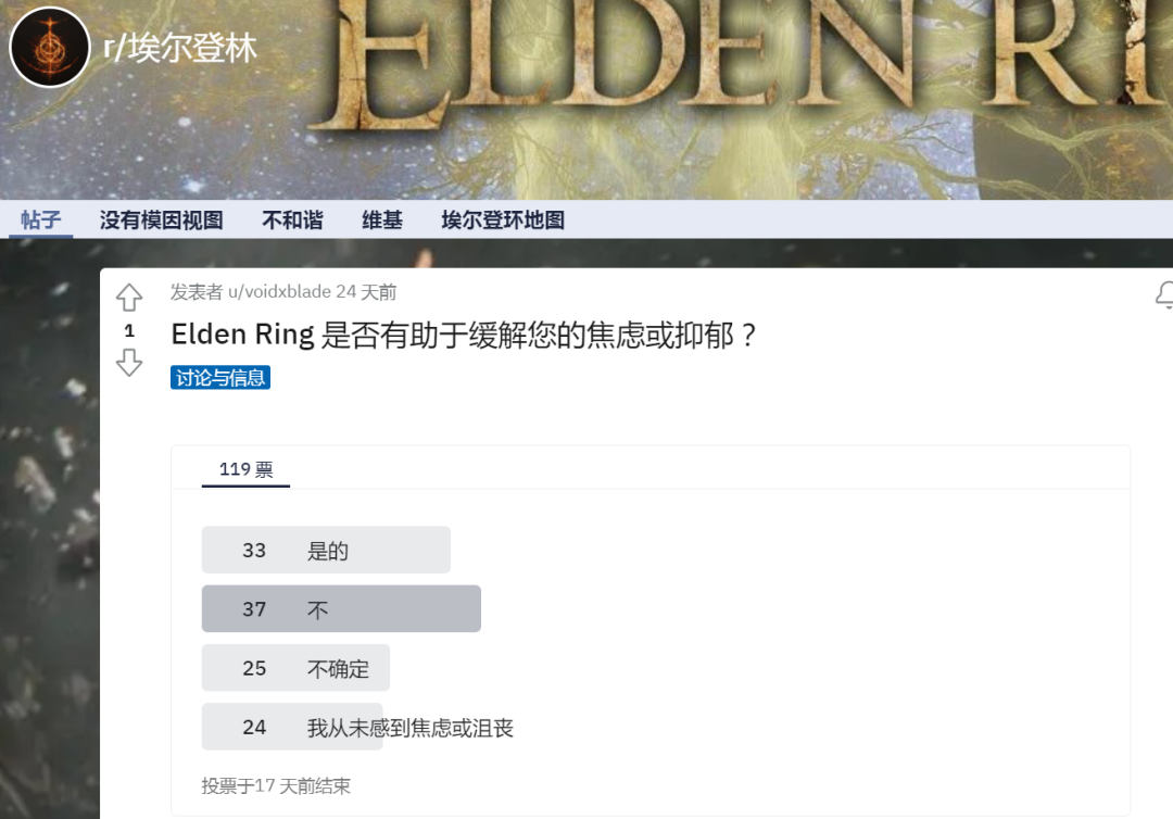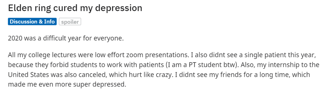 无疑,《艾尔登法环》作为FS社的集大成之作,足以称得上传世精品。但对活跃于Reddit的病友来讲,它的医疗效果可能就不是那么尽如人意了。