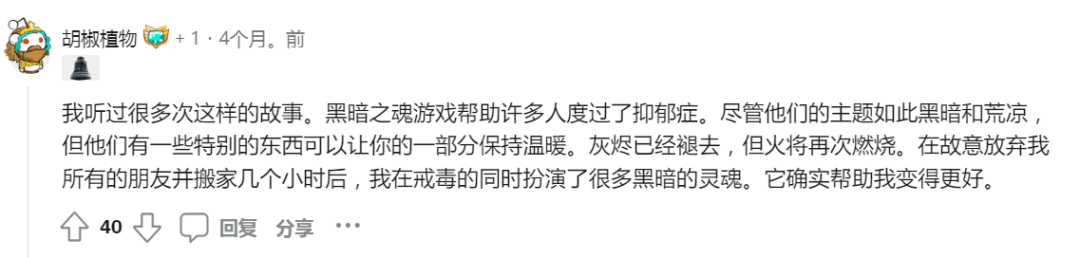 而与此相对的,则是《黑暗之魂》再次被人提起,似乎长久以来从普通患者到专业学者,很多人都相信《黑暗之魂》的游玩,对缓解狂躁与抑郁是有益的。