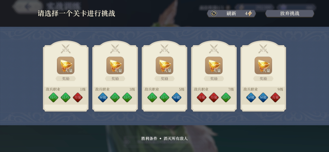 “愚者的旅程”是一个加入了塔罗牌元素的关卡制模式,相当于同类游戏中的挑战模式,将一系列固定战局编排成章节,让玩家挨个去挑战,为了丰富这些战局的玩法,战局中会出现塔罗牌,角色触碰后会获得不同的Buff,整体难度不高。