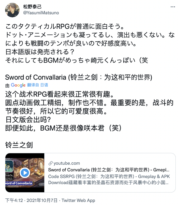 提到《最终幻想战略版》和《皇家骑士团》,就绕不开松野泰己这位有些被埋没的天才制作人,去年10月,松野发推提到了一款新游戏,称赞其出色的动画、战斗节奏和音乐。