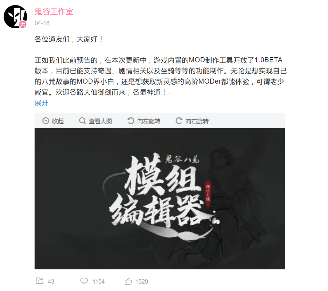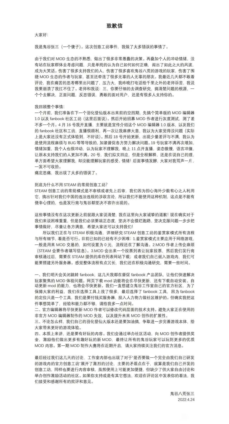 但至少到4月25日也就是今天,《鬼谷》的制作人张三发布了一封道歉信,比较实际的内容可以总结为Steam那边还在沟通但存在困难,而Fanbook这边暂时下架优化,也不会放弃。