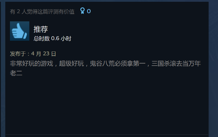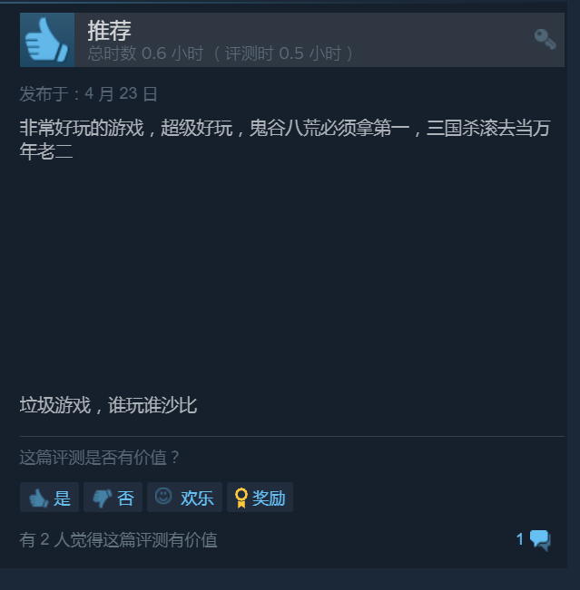 于是你今天在《鬼谷八荒》里面发现一个极其混乱混沌的奇景:好评可能是某个《三国杀》玩家在骂《三国杀》,也可能来自某个很有大局观的《鬼谷》玩家,为了骗过检测工具而打的“战略性好评”。