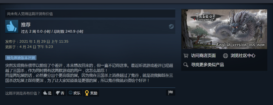 面对鬼谷玩家的巴巴罗萨行动,《三国杀》为了捍卫倒数第一的“荣誉”做了积极的防御,这主要体现在《鬼谷八荒》的商店页面中,也开始出现了大量来自《三国杀》玩家的好评。
