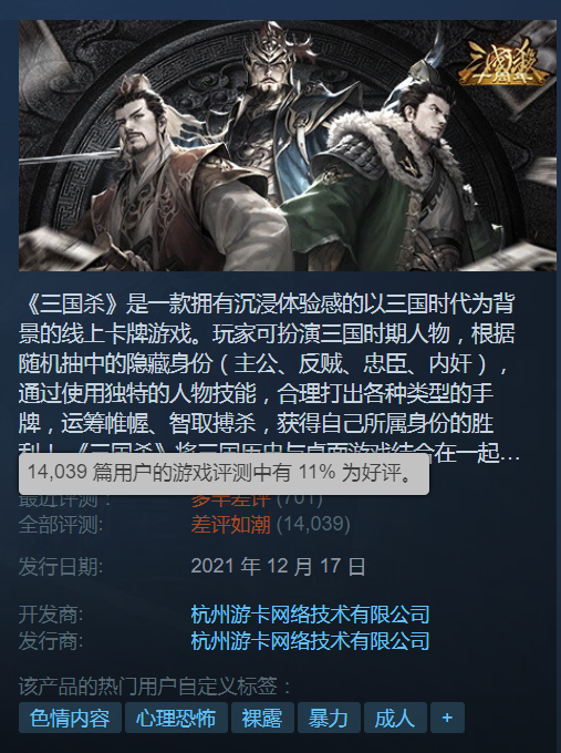 翻开商品页面可以看到《鬼谷》的近期好评率已跌至5%,而《三国杀》却足足有31%。