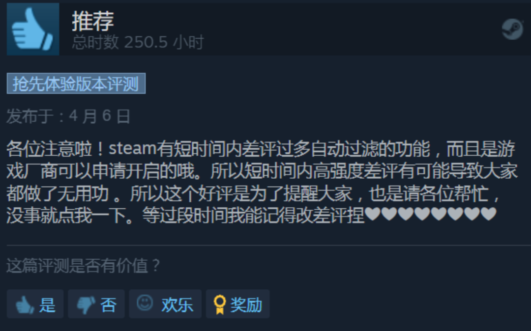 当然,这也并不是说《鬼谷八荒》就逆向夺冠了,因为从2019年开始,短期内的集中差评就有着一定被系统处理的风险,所以Valve为了防止恶意差评的出现,是有检测工具的。