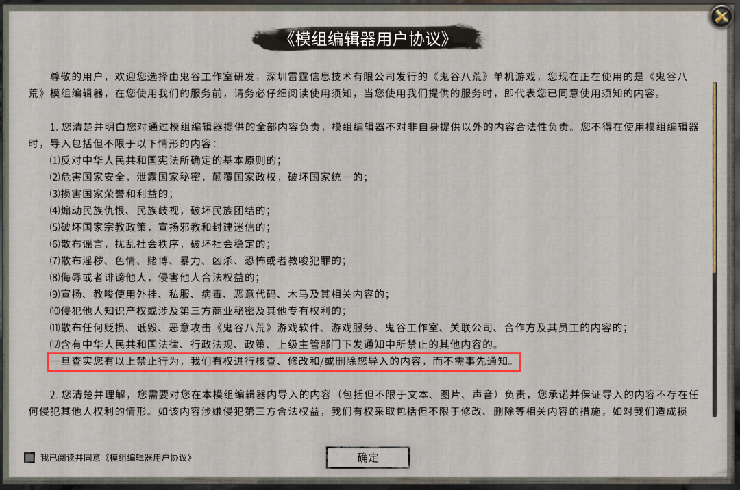 首先作为我们认知里的单机游戏,要进MOD界面必须阅读一份不长但也绝不算短的用户协议,具体的内容我们稍后再聊,但说实话这样的信息令人扫兴。