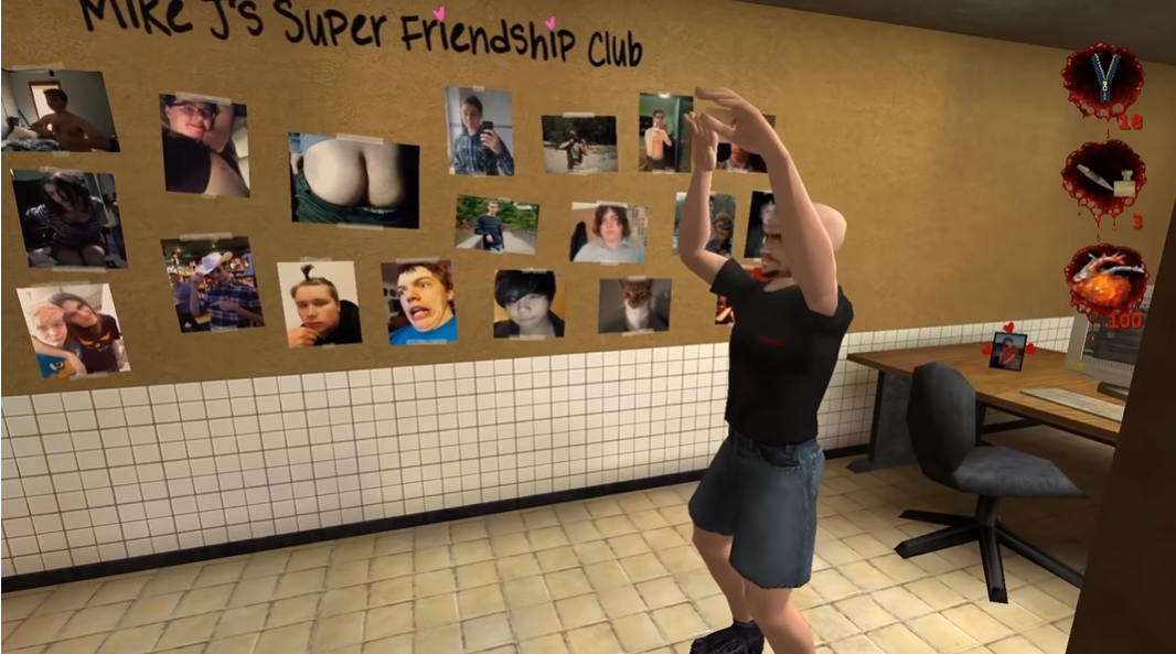 是的,你没听错,这帮乐子人把自己整个公司都搬进了游戏里,主角设定就是RWS公司的员工。游戏里来到RWS公司你会看到一面墙贴满了工作室各员工的照片,其中包含一张老白男的大腚,至于周围环境是瓷砖、是洗手池,是便器——