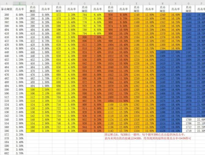 于是,暴直击概率和阈值,都需要玩家经过大量的测试之后,在Excel上汇总数据,并最终计算出来。而这些研究经验,通常会被某些大佬经过二次加工之后,以实用方式送达玩家们的手中——